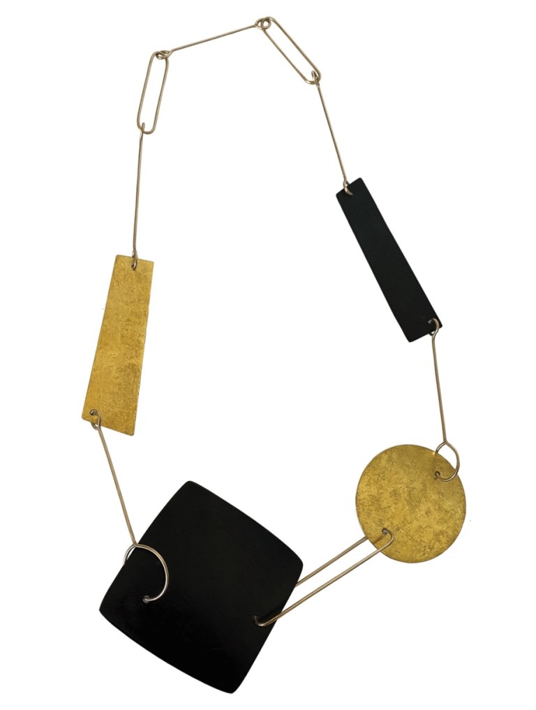 The vendor notes, “Catherine’s brings together simple forms, combining materials, including patinated steel, silver and gold leaf to create this necklace. Exploring texture, Catherine has hammered the surface of some elements, whilst others are smooth. This necklace is reversible, the circle and one rectangular shape are covered in gold leaf on one side, and silver on its reverse. Links made from 9 karat gold hold the elements together to create the final composition. Catherine Le Gal’s simple forms are a canvas for her exploration of texture. Surfaces are oxidised, scratched and sanded, creating pieces that appear timeworn.”