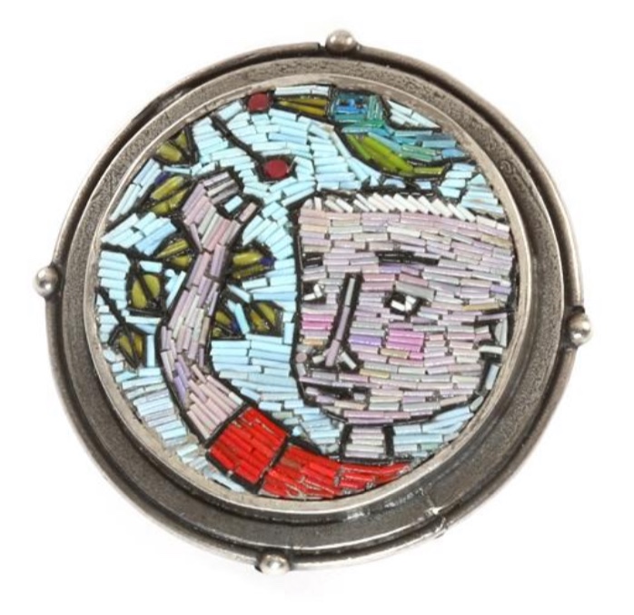 Micromosaics showing monuments and places of antiquity used to be a common souvenir in the Victorian era. Made with tiny tiles, known as tesserae, micromosaic is not something you see these days. Which makes this brooch by Cynthia Toops quite sweet. She used polymer clay for her tesserae, and they are set in a sterling silver frame. I love that, instead of a grand building, she chose a prosaic scene of a boy and a bird. Her work is really exquisite and worth a look see.