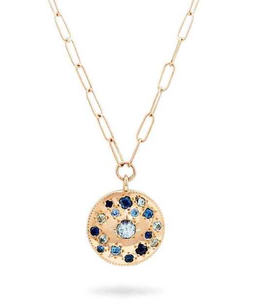 Made by Bluboho, it features blue sapphires set in 14k yellow recycled gold and comes with a 20 inch paper clip chain. They describe it as, “The modern day flower child; introspective and compassionate. A person who feels and cares deeply about the earth and human collective. This full moon shaped medallion is coloured by the night’s landscape in star set sapphires. At its centre, a round montana blue sapphire that varies in colour from piece to piece, making each truly one of a kind.”