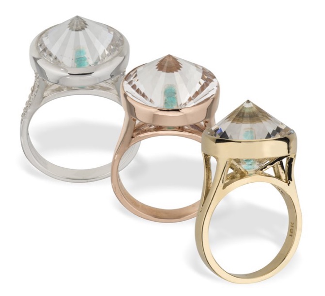 This unique design by Quore puts one gemstone into another. Per the designer’s website, “The Wheel of Light Ring is the ultimate cocktail ring, it is a shining statement piece. A paraiba tourmaline is set inside faceted quartz crystal in an architecturally designed upright setting. Light enters through the top and through the sides. Available in 18k yellow, rose and white gold or silver.” Stones inset also can be ruby or emerald, rather than tourmaline.