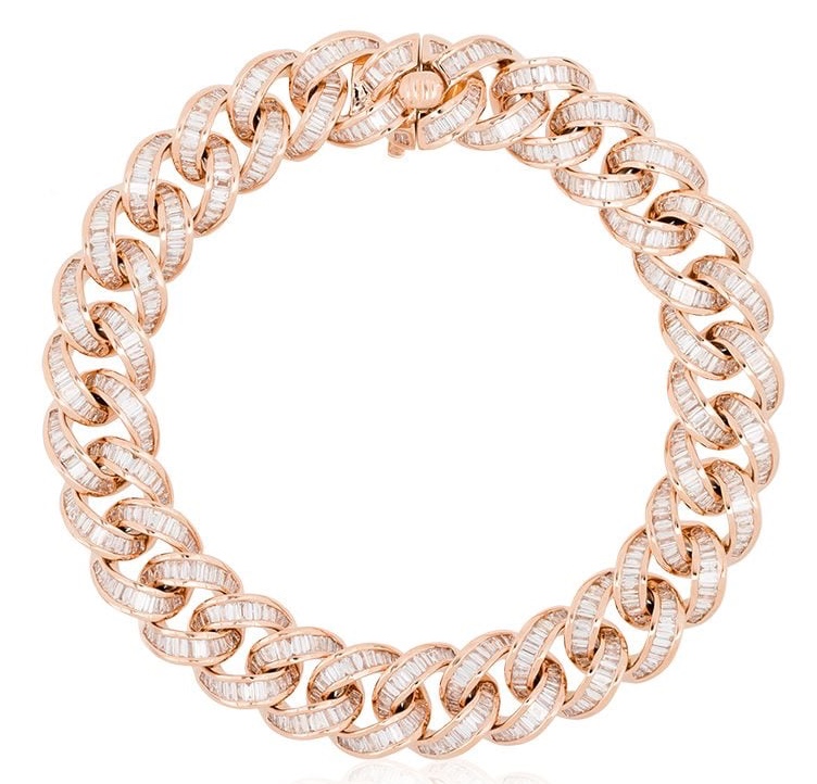 By Shay, it is in the words of the seller, “Cast from an 18kt rose gold curb chain, it’s encrusted with scores of shimmering diamonds. Shine bright.”