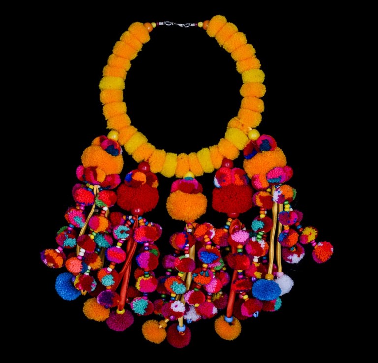 Their description: A Thai necklace of small yellow and orange wool pompoms, with five pendants of large and small multicoloured wool pompoms, and small multicoloured wood beads. At the centre of each pendant are two yellow silk bands, each with a different coloured wool pompom at the end. Each pendant is 7 inches in drop length, the necklace is 18.4 inches in length, and is finished with a silvered metal, (Nickel free), oyster clasp and ring.