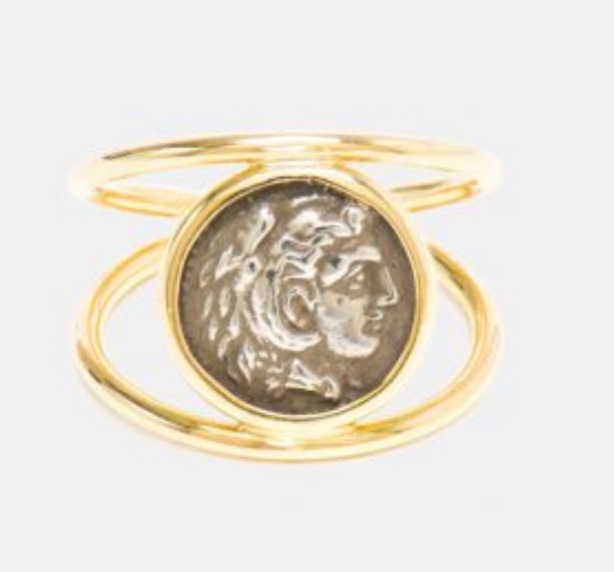 Here, a gold ring with an Alexander the Great silver coin. They note, “Depicted on the coin: Obverse-Head of Herakles right wearing lion-skin headdress. History: Herakles was the greatest hero of the Greeks. Born of the Greek god Zeus and made mortal, he attained divine status by accomplishing 12 great tasks on Earth know as the 12 labours of Herakles. The idea of a man becoming a god obviously was an attractive image for Alexander. The headdress that appears on the head of Herakles is the lion skin of the fierce Nemean lion that he killed during his first labour.”