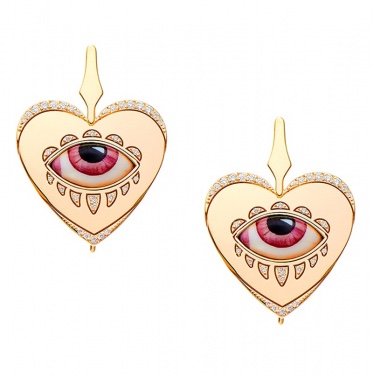 These earrings feature enameled pink eyes, set in 14K yellow gold and featuring .204 carats of white diamonds. They are priced at €4,730.