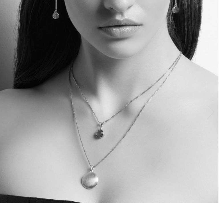 Canadian costume jewellery designer Dean Davidson offers this pretty, wearable look featuring two pendants. You have your choice of five stones above a polished disc (available in gold or silver toned metal). They note, “The Signature Layered Necklace features a multi-faceted, brilliant-cut gemstone paired with brushed gold disc, both suspended on a fluid box chain and secured with a DD toggle.”