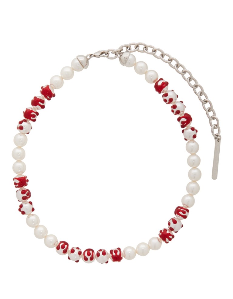 It’s described by vendor SSense as, “Faux-pearl necklace in off-white. Spatter effect in red throughout. Logo plaque at adjustable lobster clasp fastening. Silver-tone hardware. Approx. 13.5″ length.”