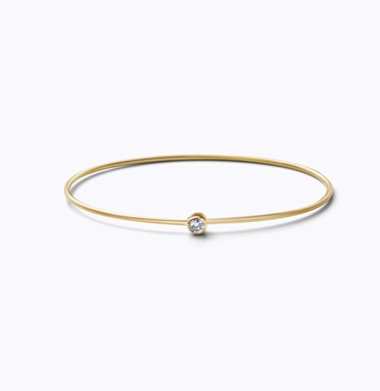 A simple bracelet with a simple description: “A single stone diamond bangle. The wire tension allows for a seamless circular hoop that hooks in place at the hidden clasp behind the stone. Available in 2 sizes.” This is made in 18k gold, and the diamond size is noted as, “0.1-0.12ct.”