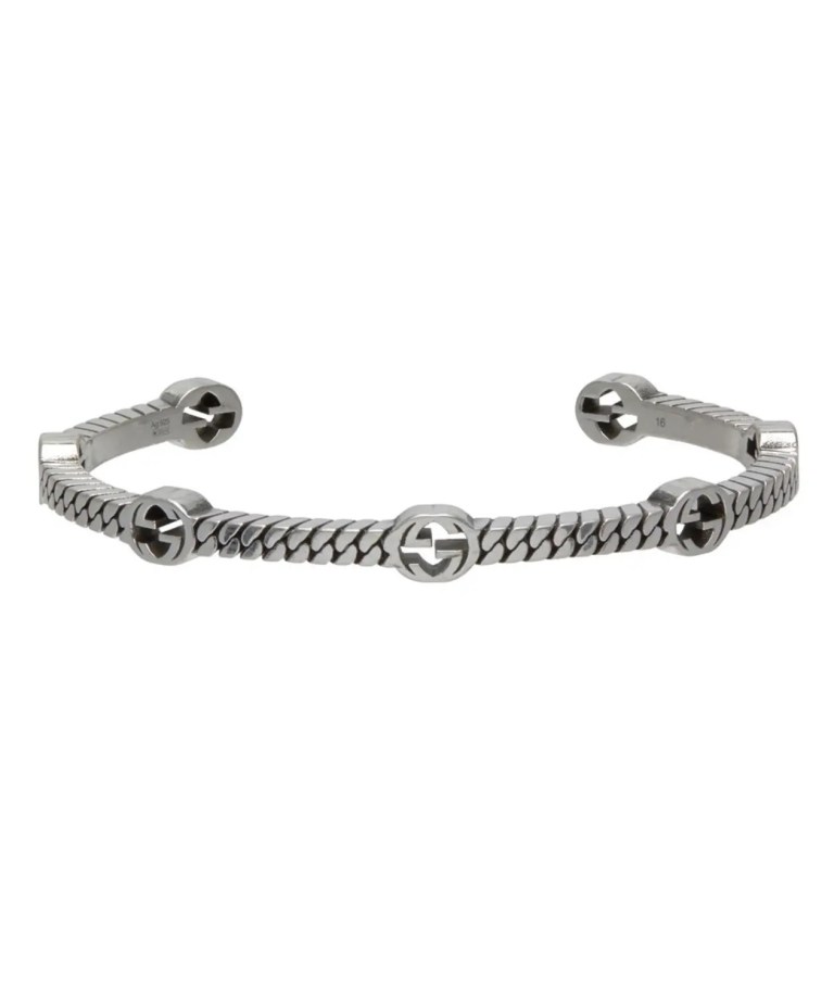 This cuff is made of sterling silver and features the brand’s interlocking Gs. They are interspersed with a rigid chain design.
