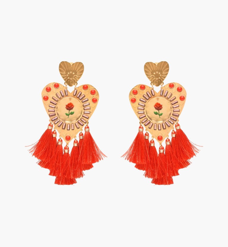 If you like big, bold earrings, this pair by Mercedes Salazar is for you. The design has an interesting back story: “This collection is inspired by the embroidered scapulars handmade by the cloistered nuns in some towns of Boyacá, Colombia. The designs are handmade by master artisans in our atelier in Bogotá, Colombia, from golden-plated bronze, vintage crystals and thread.”