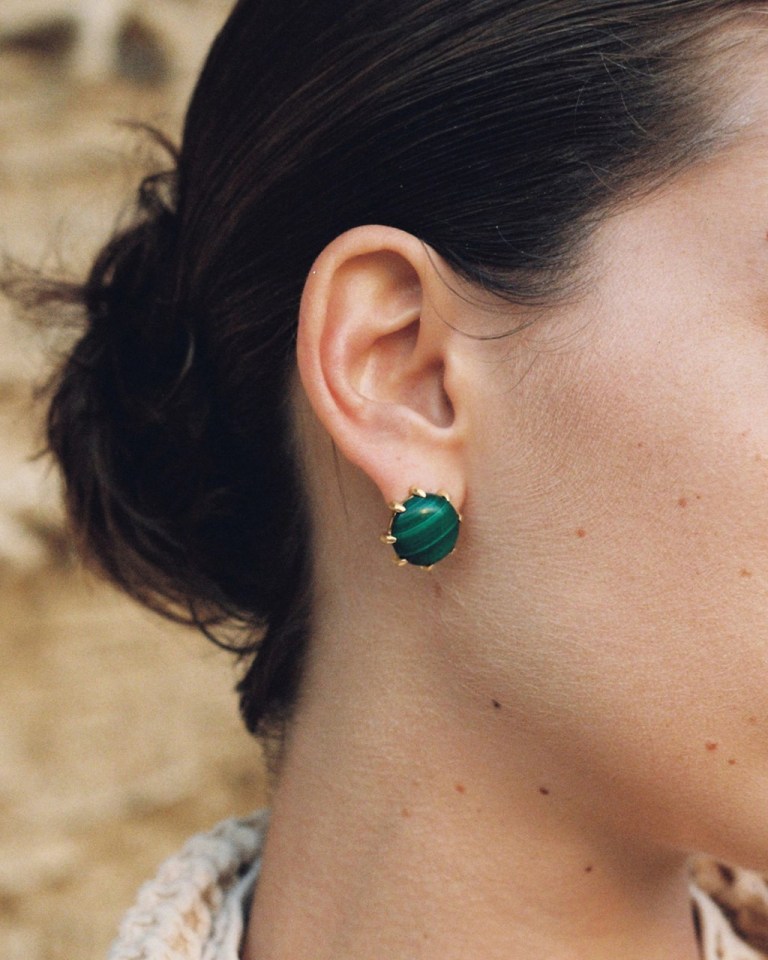 These earrings by Sapir Bachar are made with malachite cabochons set in gold-plated sterling silver. They sell for USD$345.