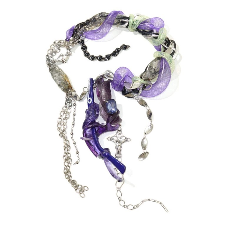 This piece incorporates resin, mesh tube, metal chain,synthetic plastic polymer and eyewear.