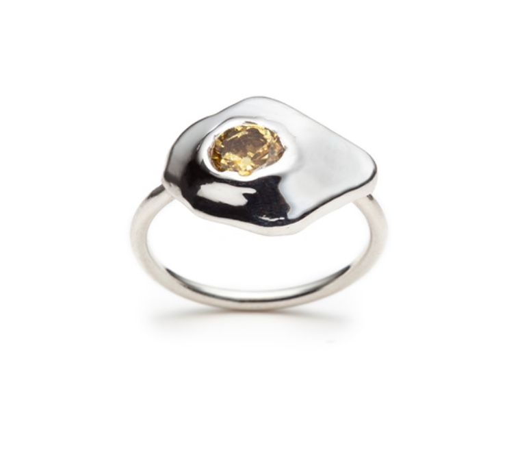 I love the witty pieces by Quebec native Alexandre Bergeron. Here, a fried egg… ring. It’s made with a green zircon set in sterling silver. Each one is custom made.