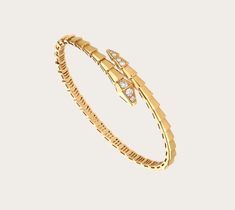 They note, “An ultra-modern interpretation of Bvlgari’s celebrated icon of glamour and seduction, Serpenti Viper enchants with its innovative and cutting-edge design. Revealing the mythical snake using geometric and sleek shapes, the bracelet coils around the wrist striking with the precious beauty of the scales and the distinctive sinuosity of the Serpenti collection. Serpenti Viper bracelet in 18 kt yellow gold with demi-pavé diamonds.”