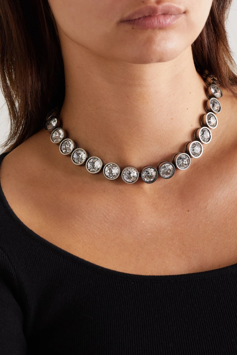 The kind of “headlight” necklace shown here is a bit of a perennial jewelry favorite. This one, by Balenciaga, is made of round crystals set into antiqued silver tone metal.