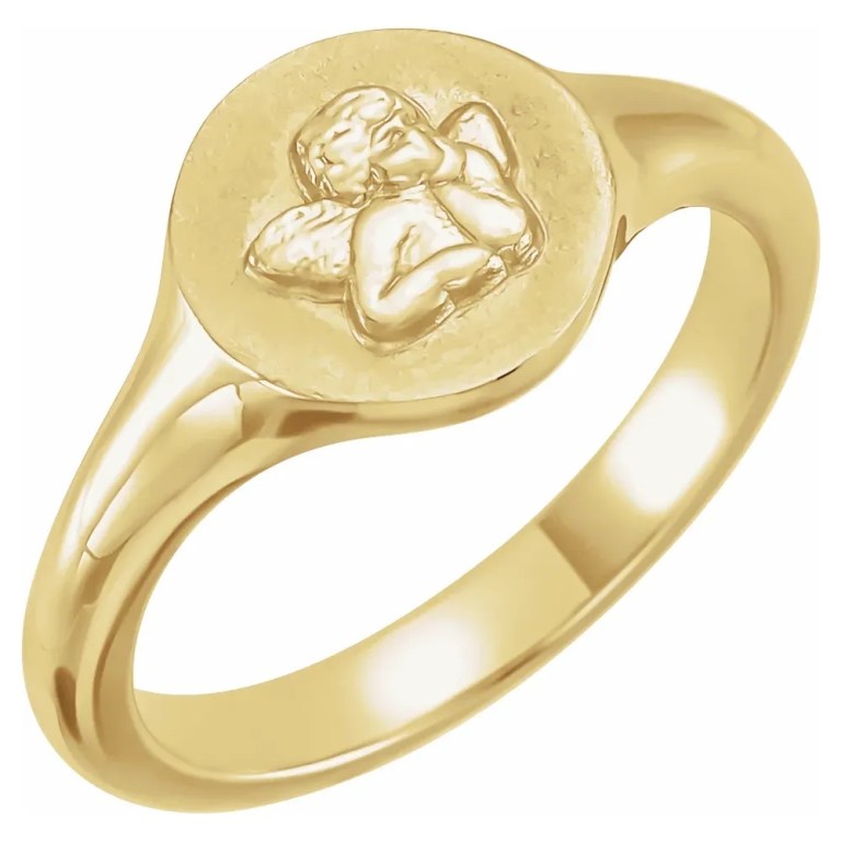 Angels/putti/cherubs have long been a favoured design element. Here, by 302 Fine Jewelry, you can have the image on a 14k yellow gold pinky ring.