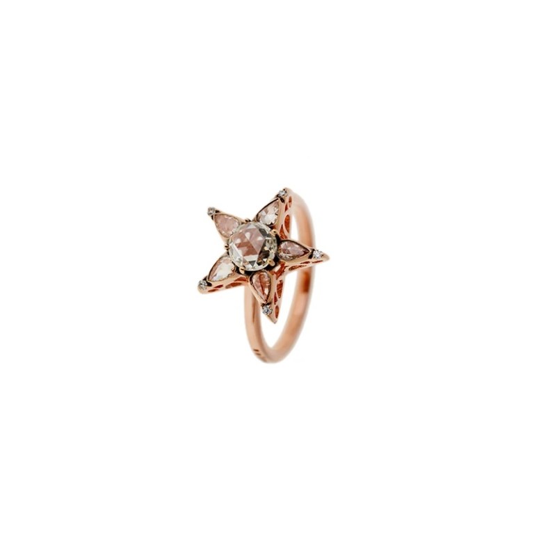 The design of this ring by Selim Mouzannar echoes ancient jewelry motifs with its use of a star. The piece is made with 14k rose gold set with marquise and round diamonds (weight not noted).