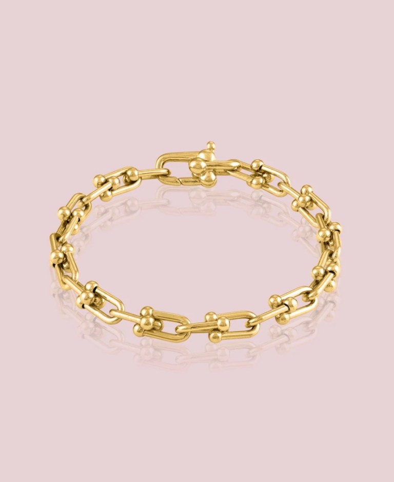 This gold plated brass bracelet uses links with an equestrian flair; however, they have a different muse in mind: This is inspired by our favorite IT-girl Zoë Kravitz. The bracelet draws inspo from her standout aura and effortless style.