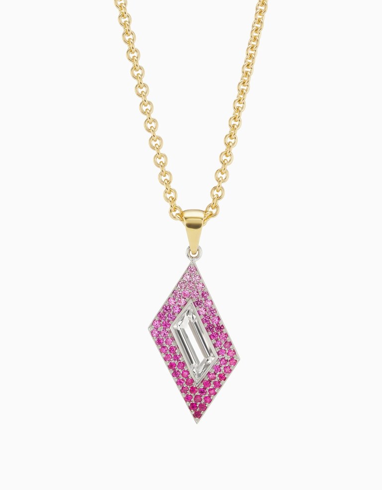 They note, “The Rhomboid Necklace is the perfect everyday layering piece. Featuring a rhomboid shaped topaz surrounded by ombre pink sapphires, the necklace is a chic everyday staple.” Stone weight is not indicated.