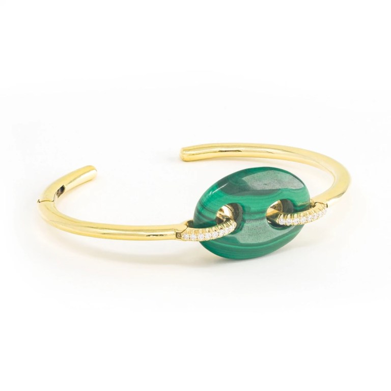 This 18k gold bangle bracelet by Jenna Blake can be customized by changing the semi-precious piece in the middle. It’s shown here with malachite, but is available with a tiger’s eye, coral or carnelian stone. There isn’t an indication of the cost to purchase just this element.