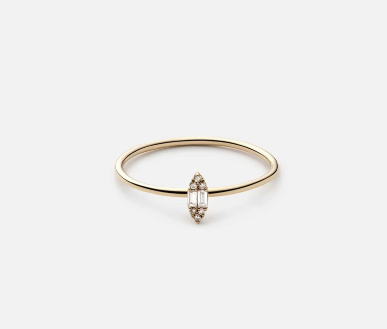 “The women’s Marquise Illusion Pave Ring features baguette and round ethically sourced diamonds carefully placed together to create the look of a larger stone. Made in 14k yellow gold.” The diamond weight is .05 carats.