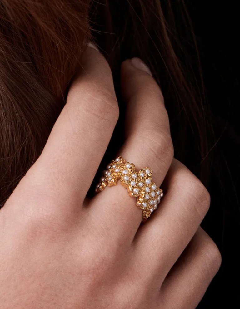 Made of gold plated sterling silver, it is set with tiny pearls. It’s large enough to make an impact without being difficult to wear.