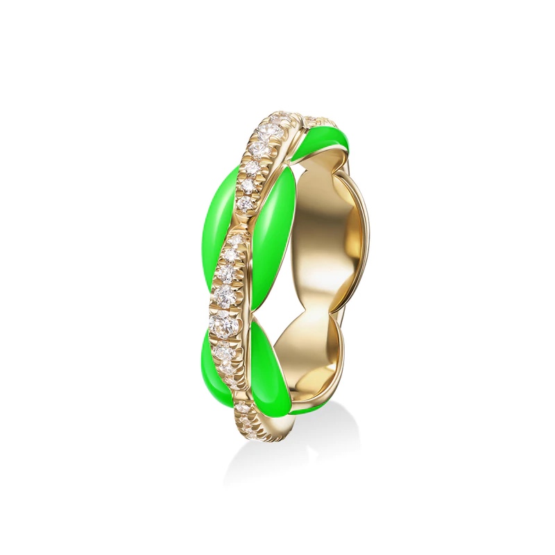 This ring is meant to be worn on the pink (but can be worn stacked with others from the collection or elsewhere). It’s 18k yellow gold with bold green enamel, and sells for USD$3,950.