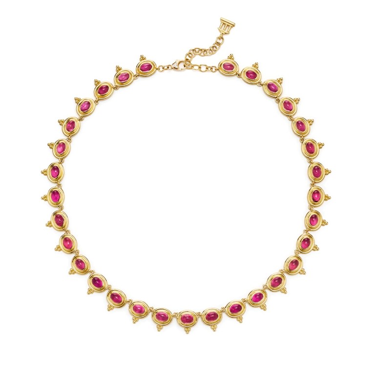 This necklace is, the site notes, “composed of some of nature’s richest pinks. Featuring a carefully selected suite of rosy, pink tourmalines set in our signature yellow gold, this piece is utterly stylish and effortlessly regal. Easily adjusted to the length of your choice, this jewel looks as stunning on its own as it does layered with your other favorite Temple St Clair necklaces.”