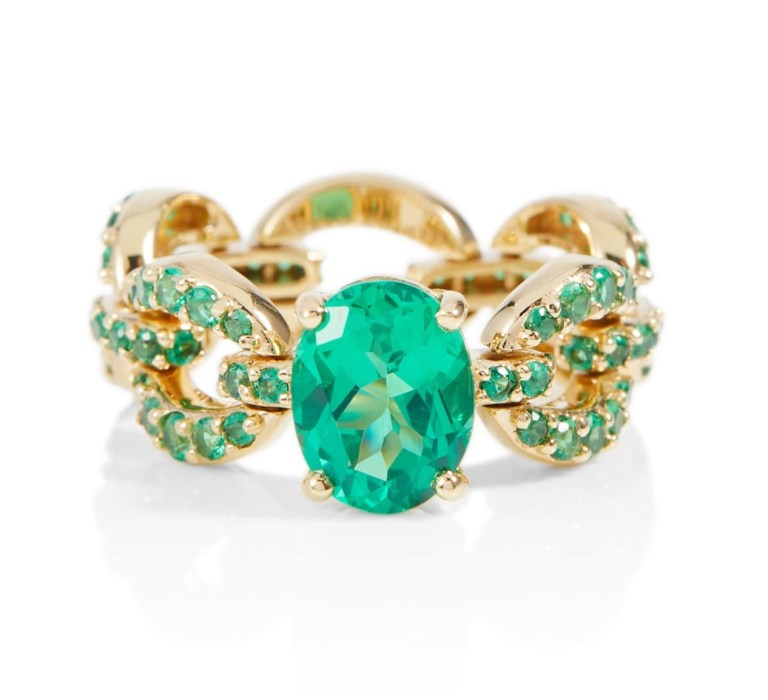 The designer’s site notes, “The Catena Petite 18kt gold ring from Nadine Aysoy will finish everyday looks and beyond on a dazzling note. It’s made from the label’s signature oval links in yellow gold that are encrusted with 0.51ctw pave’-set emeralds with an oval 1.26 ctw emerald set in the center.”