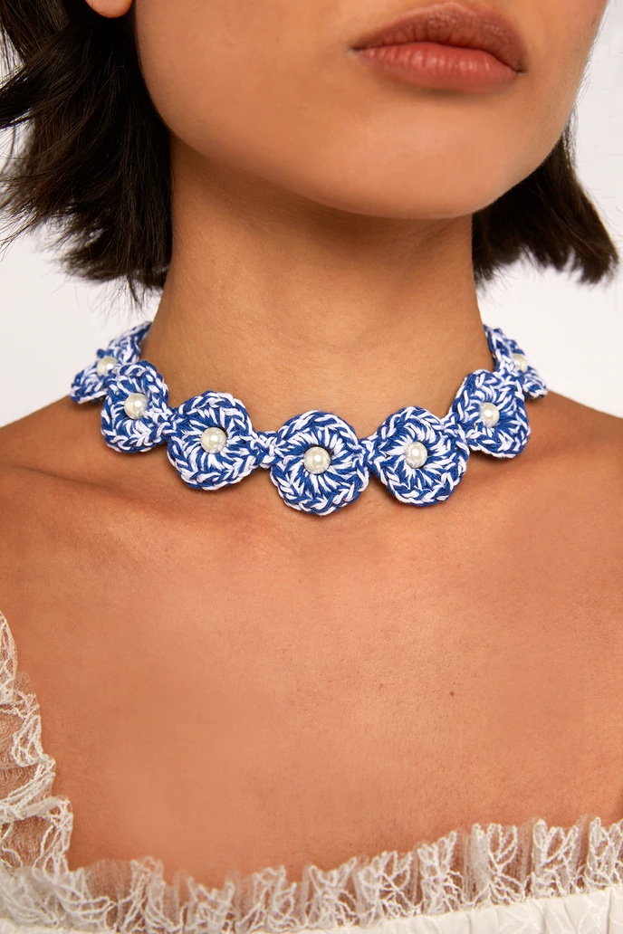 The site notes, “The Camber Necklace choker features navy and cream cotton twine, fashioned into flowers with a faux pearl encased at each center.”