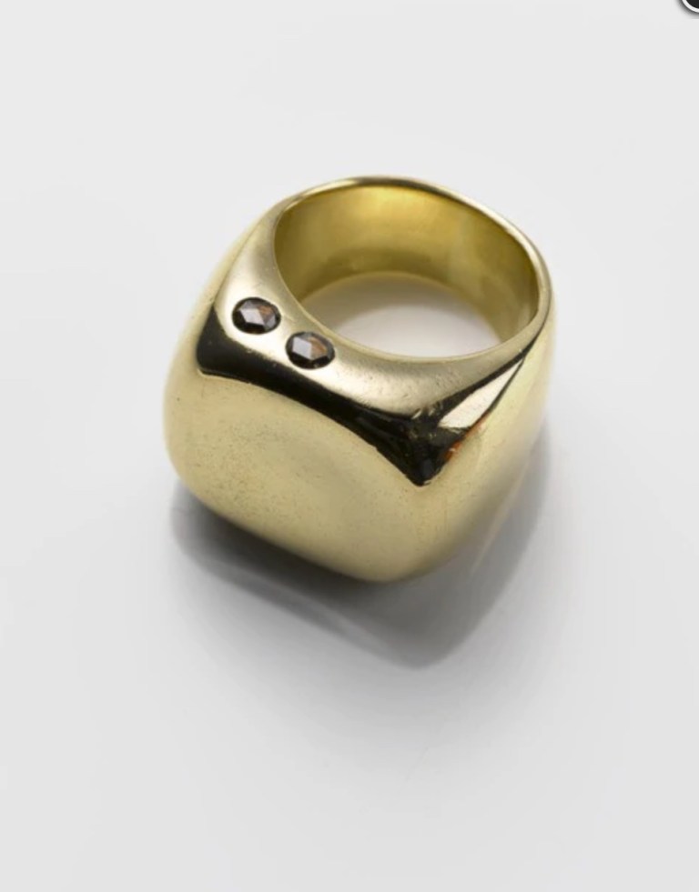 This big chunky ring by James Colarusso is a bit of a mystery. The designer’s site has no information the gold karat or the diamond colour or weight.