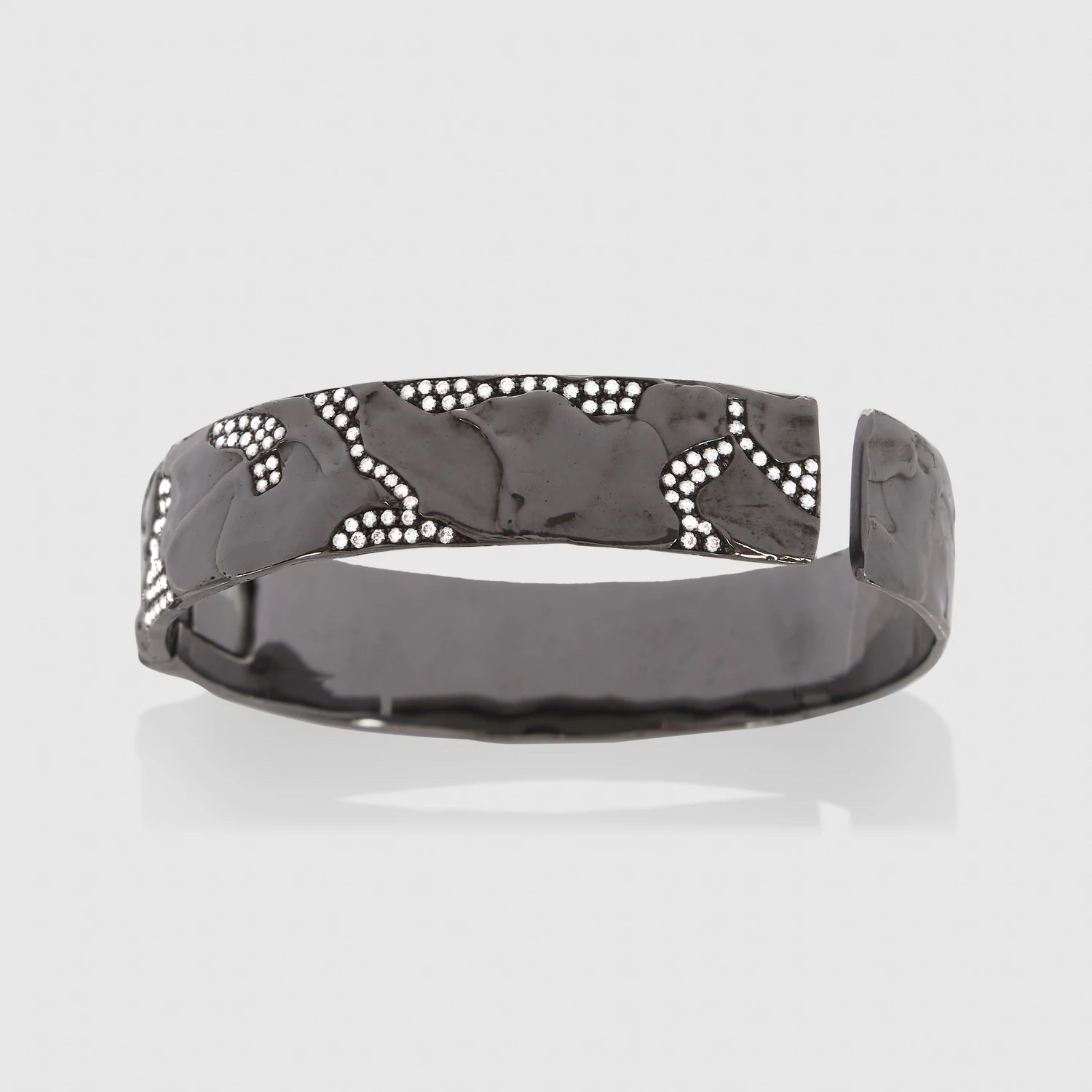This cuff bracelet by Patcharavipa is made with 18k black textured Siam gold set with .59 carats of diamonds. It is also available in rose, yellow or white gold.
