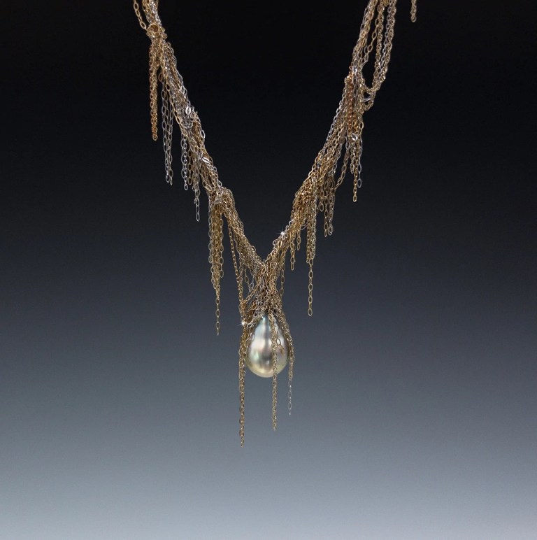 Here, he features “a teardrop shaped Tahitian pearl suspended by tri-color 14k gold fringe chain.”