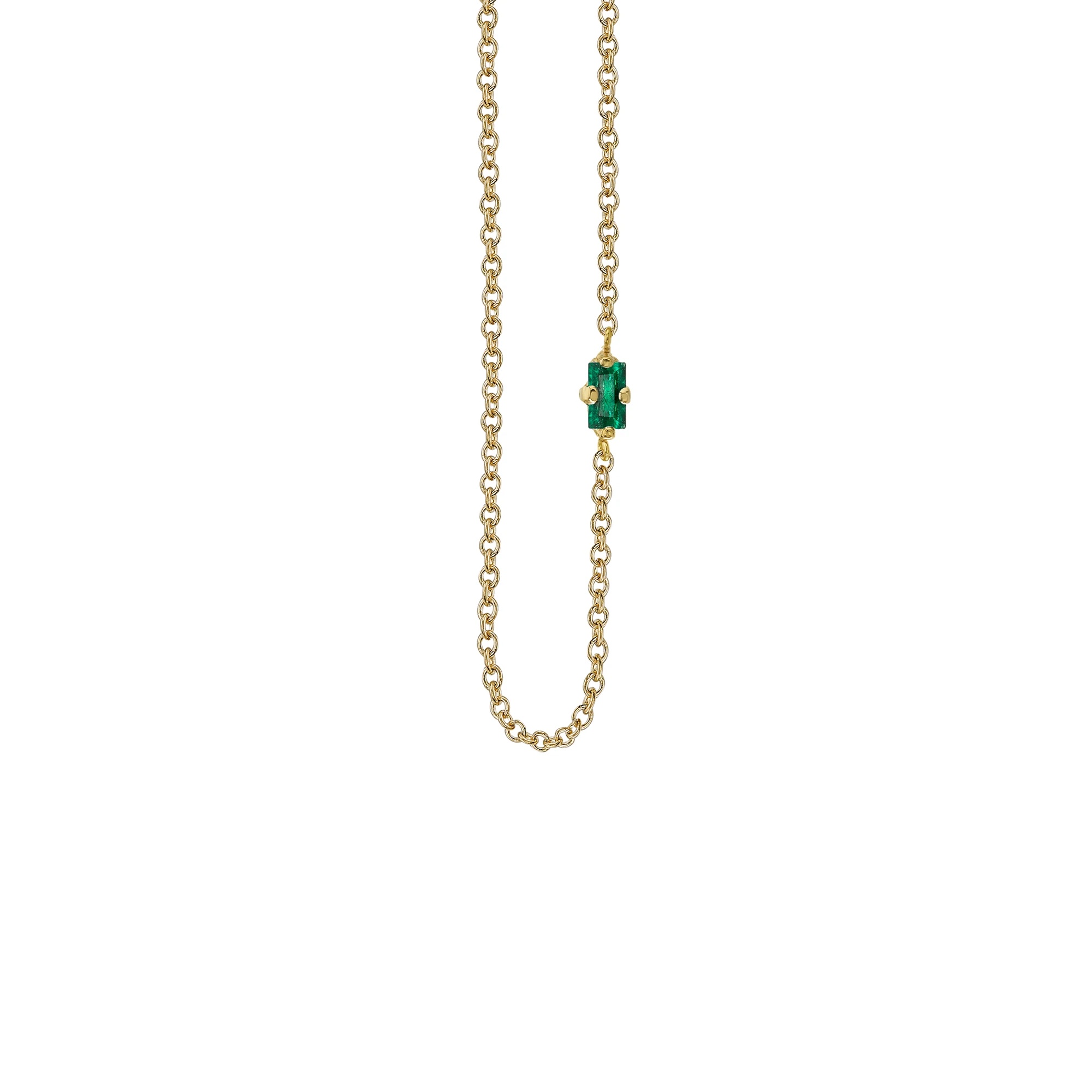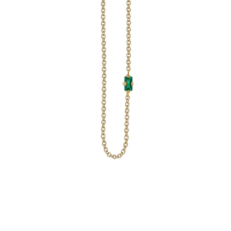 This necklace by Lizzie Mandler takes a delicate gold chain and accents it with a small baguette emerald stone.