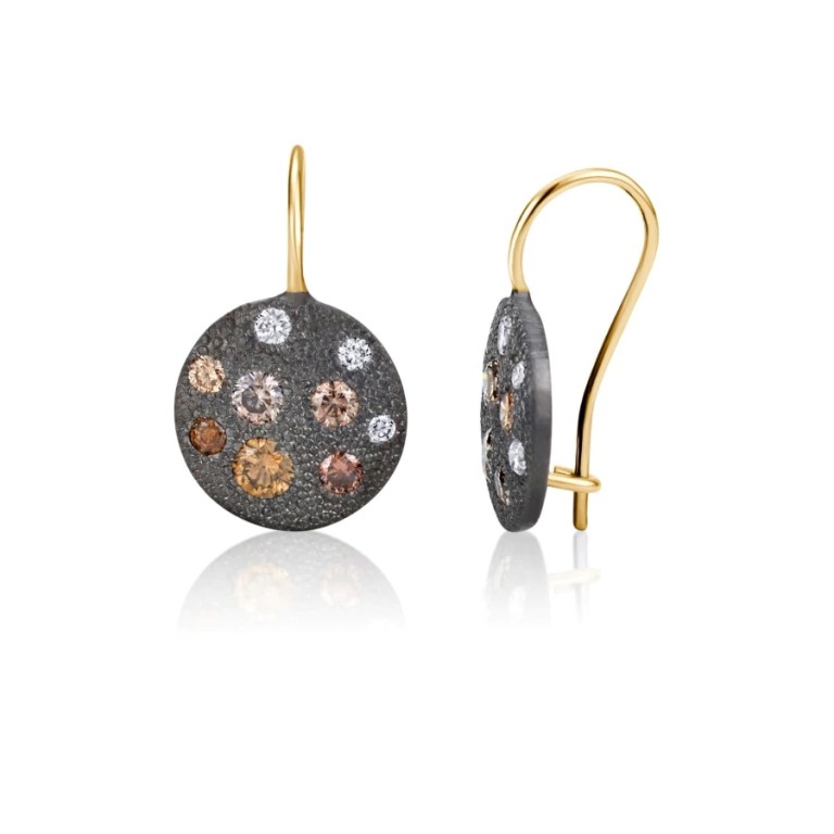 They are made with blackened sterling silver and a 14k yellow gold ear wire, set with .98 carats of coloured diamonds.
