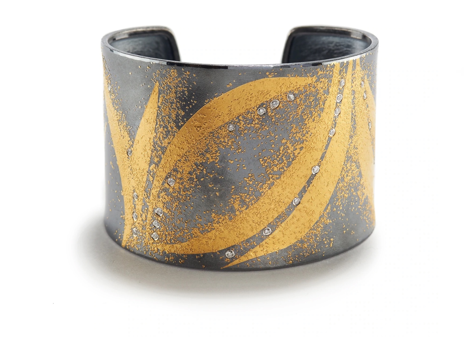 “Peter Schmid of Atelier Zobel paints an exquisite picture in luscious, wearable adornment. Fluttering gold strokes grace the darkened surface of sterling silver, creating a beauty of contrast, value and shapely disposition. Dusted with specks of high karat gold, texture commands the fascinating composition. Faintly touched with accents of sparkling white diamonds, they drift along the graceful, curvaceous, golden forms. Skillfully devised, the piece seamlessly slides onto the wrist and fits like a glove. Twisting the turning, the hand is not stiff, nor the wrist constrained. Gilded, tantalizing charm, Schmid continues totempt us withintriguing design and provocative allurewith hisextraordinary artistic imagination.”