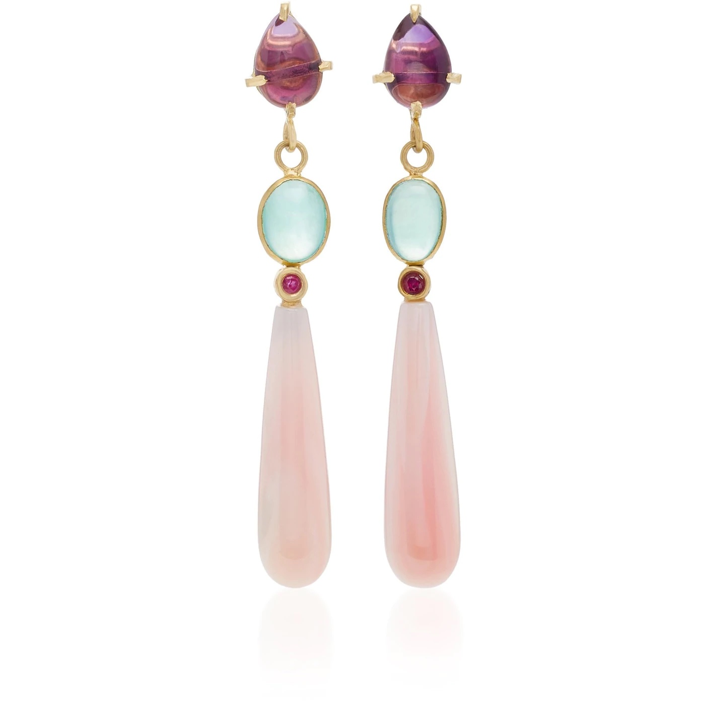 The star of these earrings is .10 ct pink conch drops, topped with Peruvian blue opals totaling 11 ct, and rubies totalling .12 carats, set in 18k yellow gold.