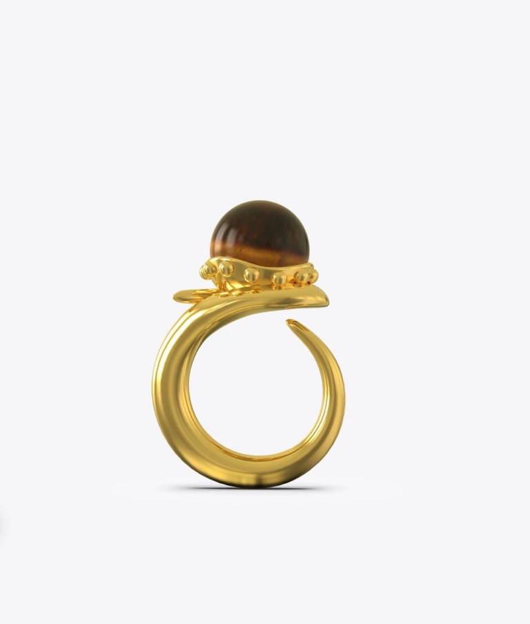 This intriguing design by Khiry fuses a brown cabochon tiger’s eye stone atop a sterling silver gold plated setting.