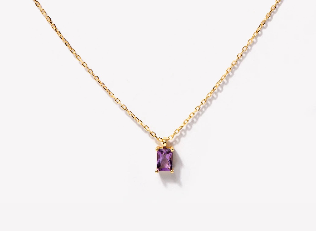 This features a gold plated sterling silver chain with a baguette cut amethyst stone. Other stones are available.