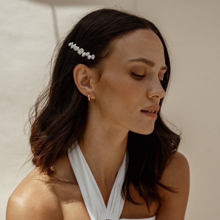 This clip by EllaPalm is made with gold plated brass and freshwater pearls. They note, “The Milana freshwater pearl hair clip features freeform freshwater keshi pearls set on a sleek gold plated hair slide.