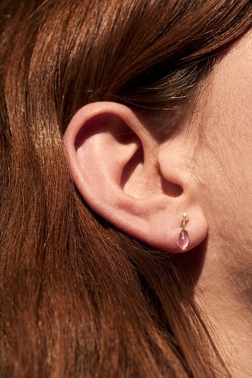 It also has a charitable aspect: “This barbell earring features a dainty pearl and a shimmering teardrop amethyst connected by a recycled 9kt gold bar. Sold as a single stud so you can mix and match with other barbell studs for a playful look. Handmade to order using recycled 9kt gold from our studio in London, and also available in recycled sterling silver. 10% of all profits from sales are donated to charity, split equally between The Maya Centre and the Marine Conservation Society. For more information please visit our values page.”