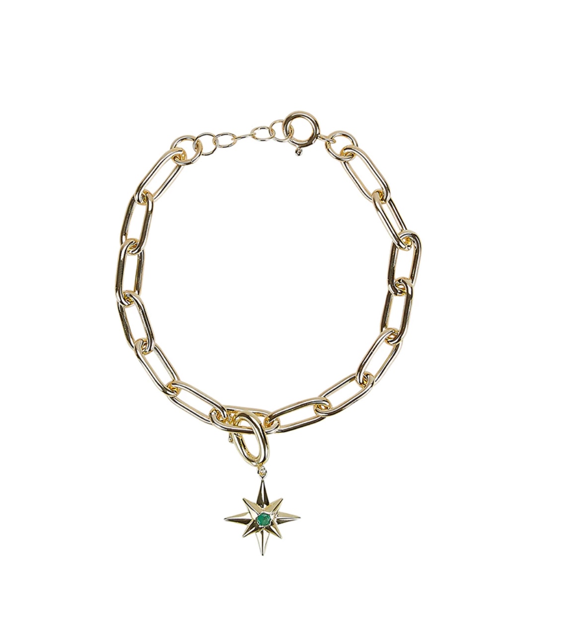 It’s made with 14ct gold vermeil on 925 Sterling Silver for the emerald set charm, and the bracelet is 18c gold on bronze.