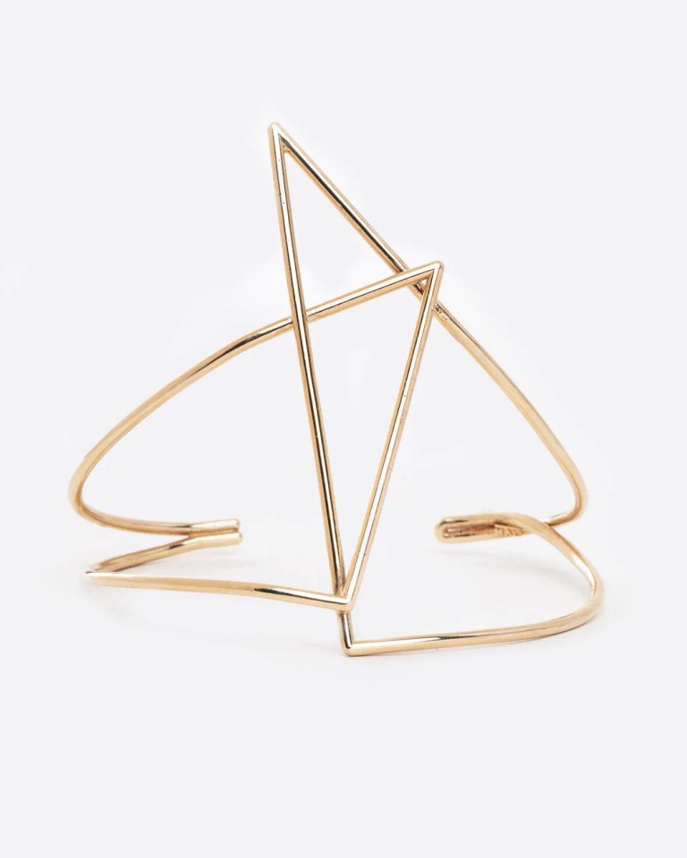This gold bracelet by Mau Is made of “two yellow gold wire triangles intertwine(d) and round together.