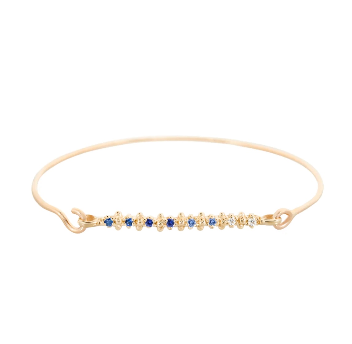 “A 14k gold bar with 8 blue and white sapphires, adorned with Ruta’s signature coral-like bud details, is set across a secure locking cuff bracelet; the Carmel Bangle is the perfect accessory to add interest and sparkle to any wrist. Composition: 14k Gold (1.4mm), Blue Shades-White Sapphires (0.25ct.)”