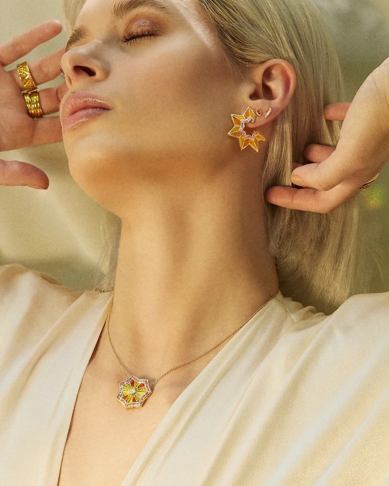 These earrings by ARK use plique a jour to form hoop earrings, accented with pink sapphires. Their site notes, “The sun symbolizes light, wisdom, truth, the light of all souls, knowledge, intelligence, wakeful consciousness, existence, immortality, and heaven.”