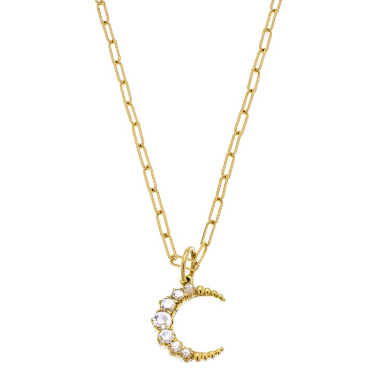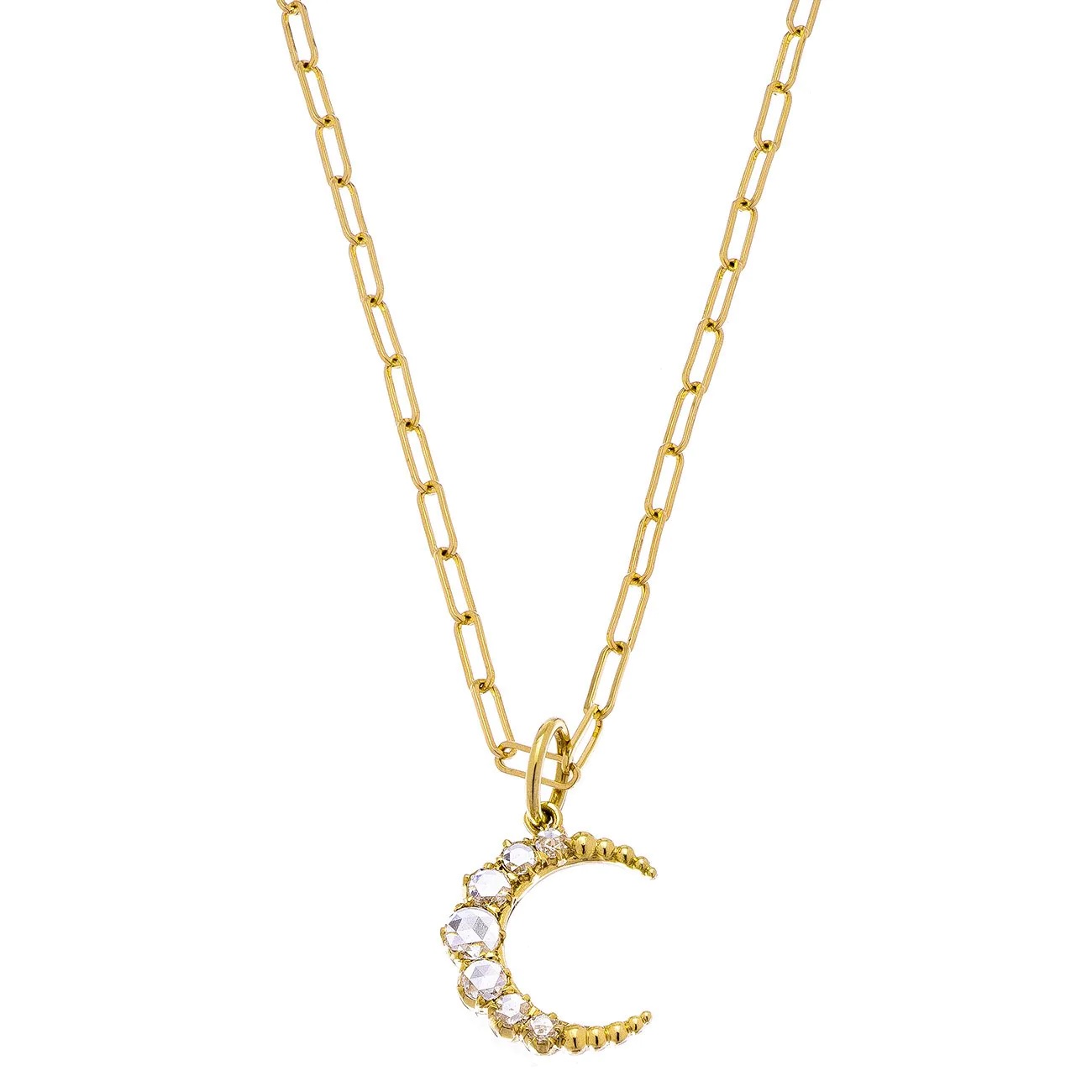 This necklace by Sethi Couture features a quarter carat of white diamonds set into 18k yellow gold. It includes a 24 inch paperclip chain. It is also available in white or rose gold.