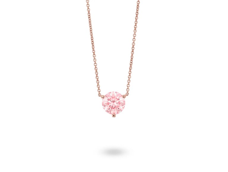 This necklace features a 1.5 carat pink stone on an attached 14k rose gold chain. It is available in other stone sizes.
