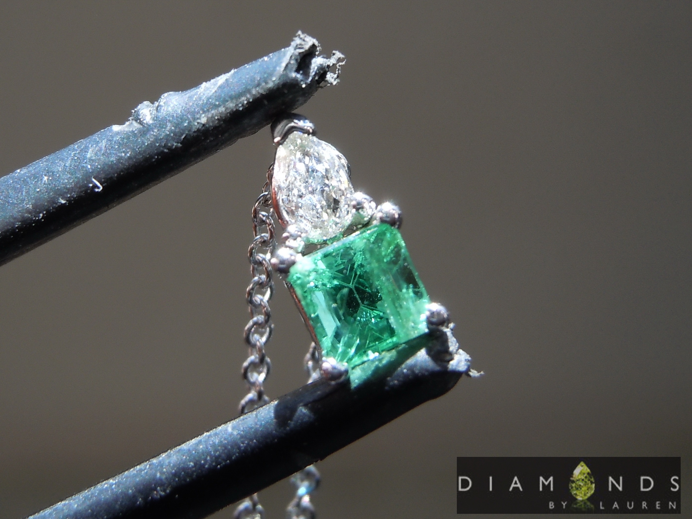 This necklace features a .38 carat emerald with a .07 pear shaped diamond on top. It’s on a 16 inch 18k white gold chain.