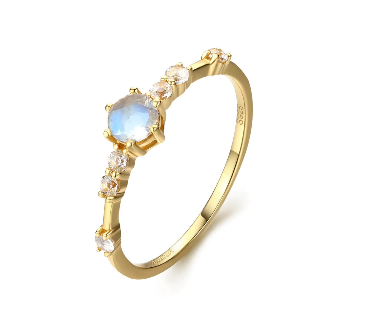 Azura Jewelry has a striking range of affordable pieces. This pretty ring is made with white topaz and moonstone.
