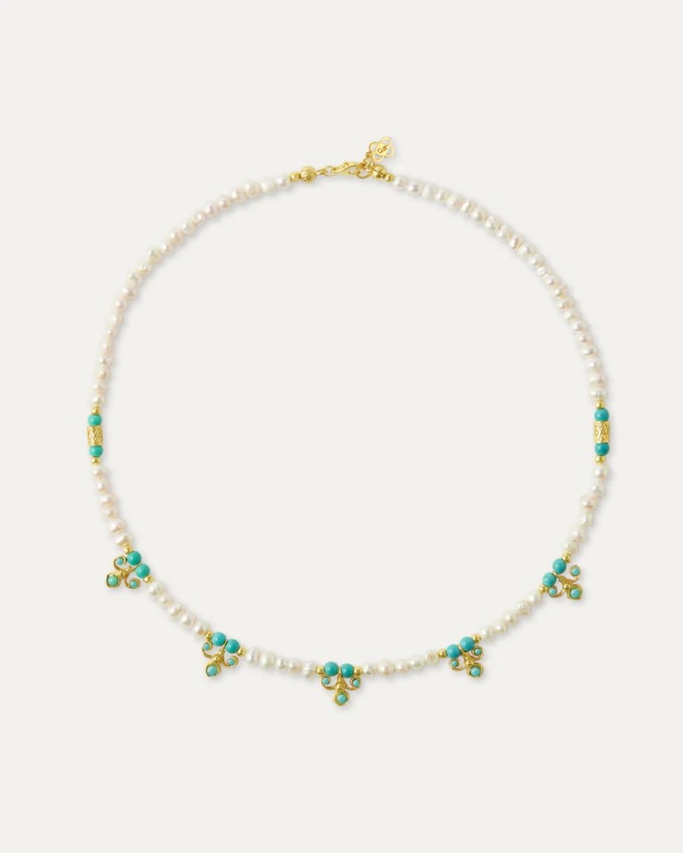 This necklace features pearls and turquoise, with findings gold-plated over brass.