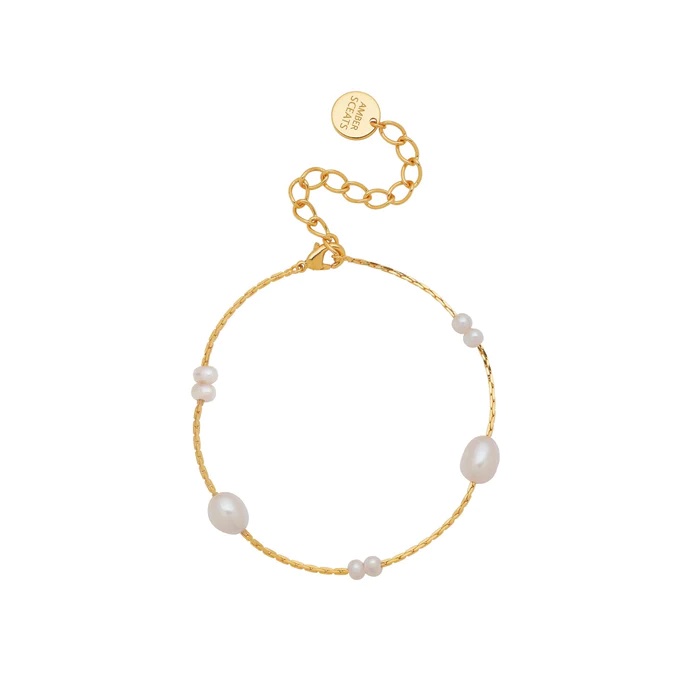 This sweet costume jewelry bracelet by Amber Sceats is made of gold plated brass chain accented with freshwater pearls.